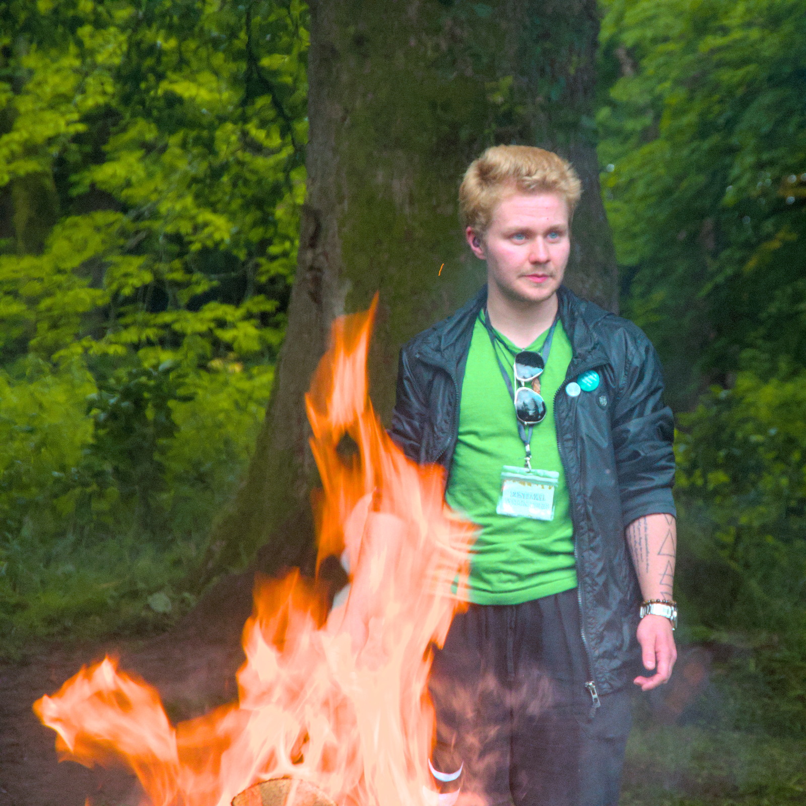 a young man standing in front of a fire